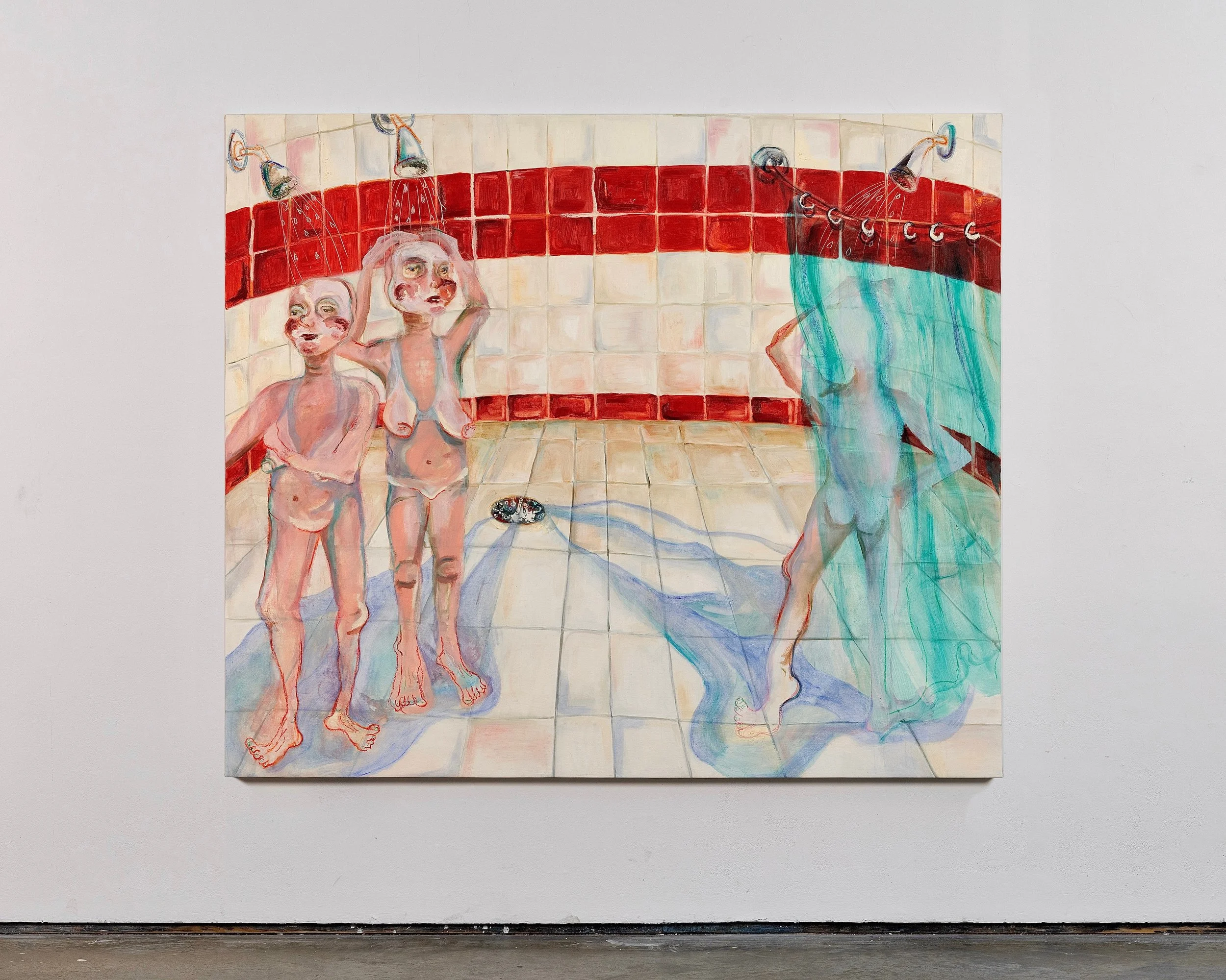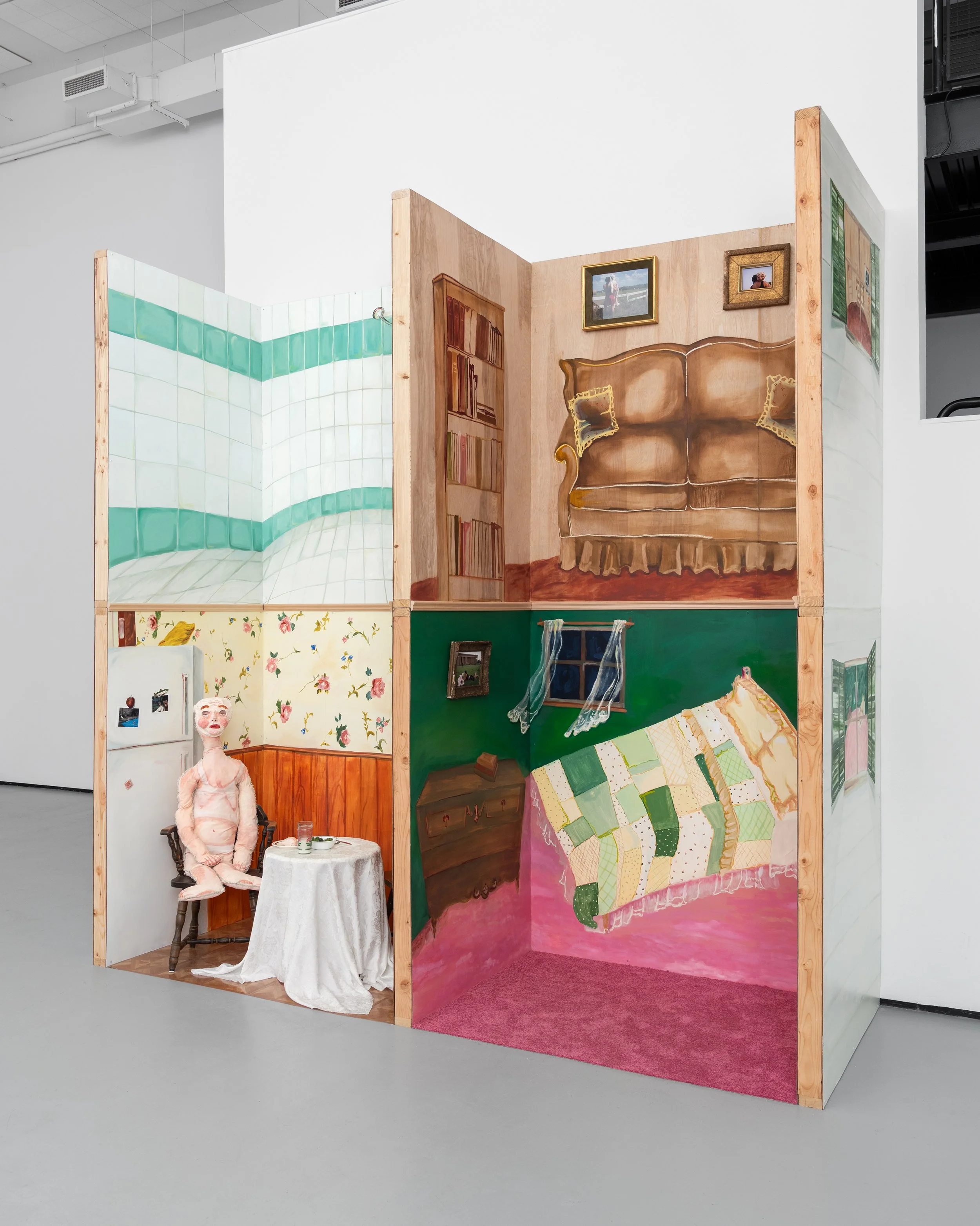Relying on her own elusive memories and working from instinct, she creates work that blurs the lines between lived and created experience. Much of her work is in reference to her northeastern upbringing in rural Connecticut and suburban New York. Familiar scenes are found throughout her body of work - the peeling wallpaper and woodpanelled walls that hung in her grandparents' kitchen, the uncomfortable shades of green and pink that were ubiquitous in 90’s homes, the back seat of a car where raindrop races were viewed. She positions her sometimes-genderless, usually-naked figures in these settings, bringing to life her own twisted realm.