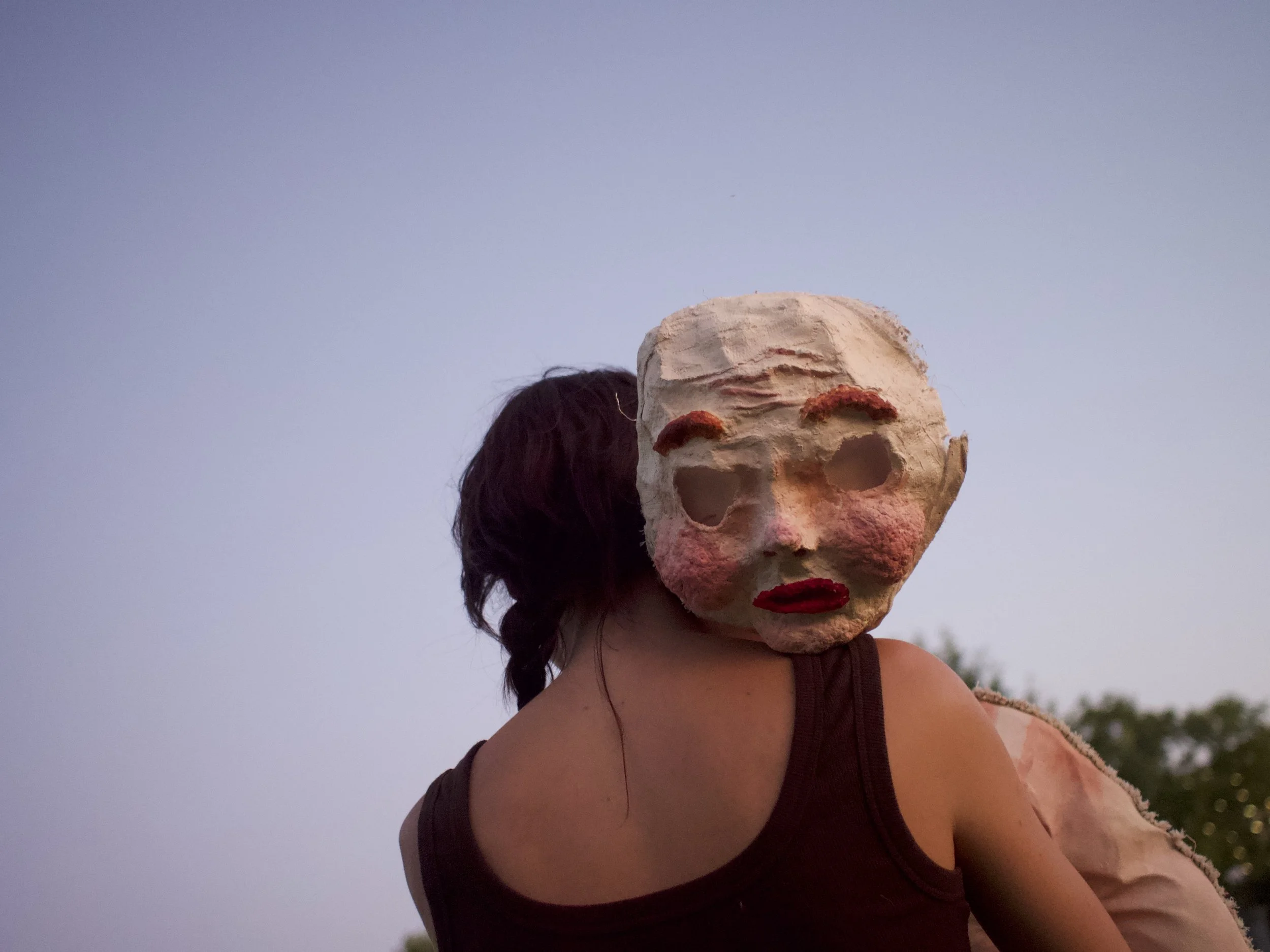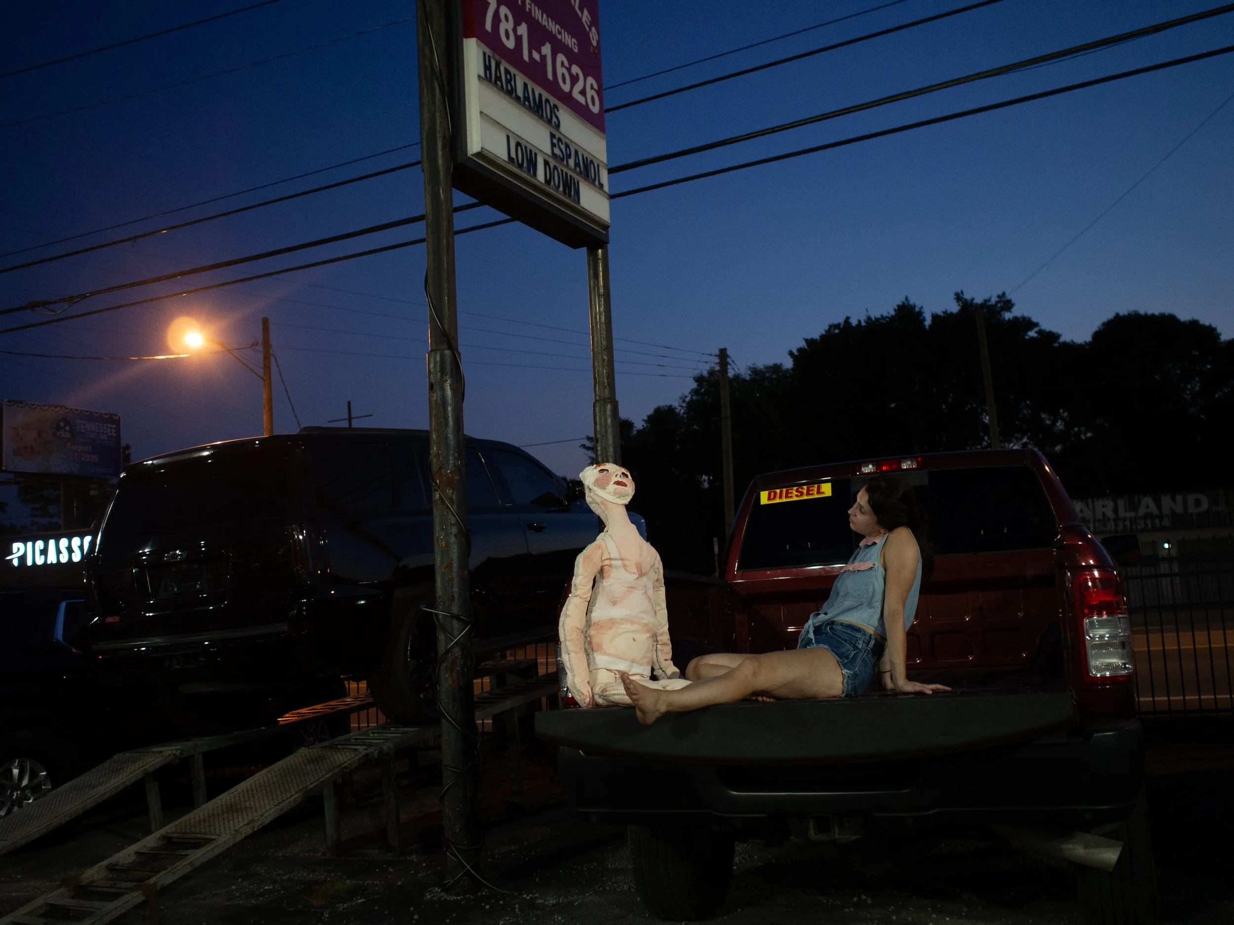 It’s undoubtedly Americana; the experience of living in 2020’s America is a consistent theme throughout her work, and Amy has said that the beings are a vehicle to explore this existence. Chasse’s photo practice led her and her doll on a road trip through a sampling of so-called “flyover” states, on a route stretching from Connecticut to Texas and back again (all in her little blue Honda Civic that was held together with bubble gum and rubber bands). The photos she took feature scenes many of us come to expect in Anywhere, USA. Used car lots promoting financing options for massive Diesel trucks, diner breakfasts complete with a plateful of biscuits and a full glass of whole milk, shrinefuls of plastic sports trophies by the fireplace. She even visited Nashville’s exact-size replica of the Parthenon (no really, they have that).