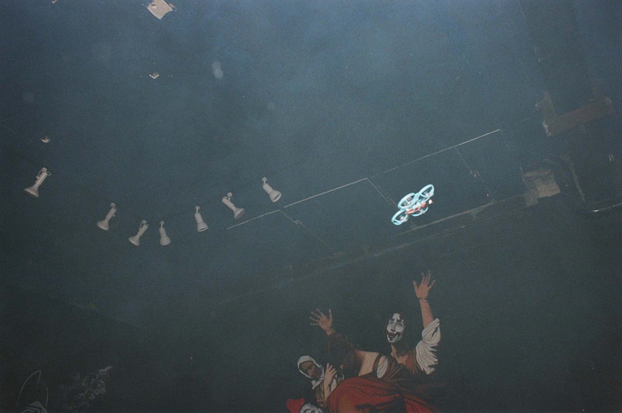 Turns out he’s watching the entire show through the drone and is in the pit with drone goggles on.