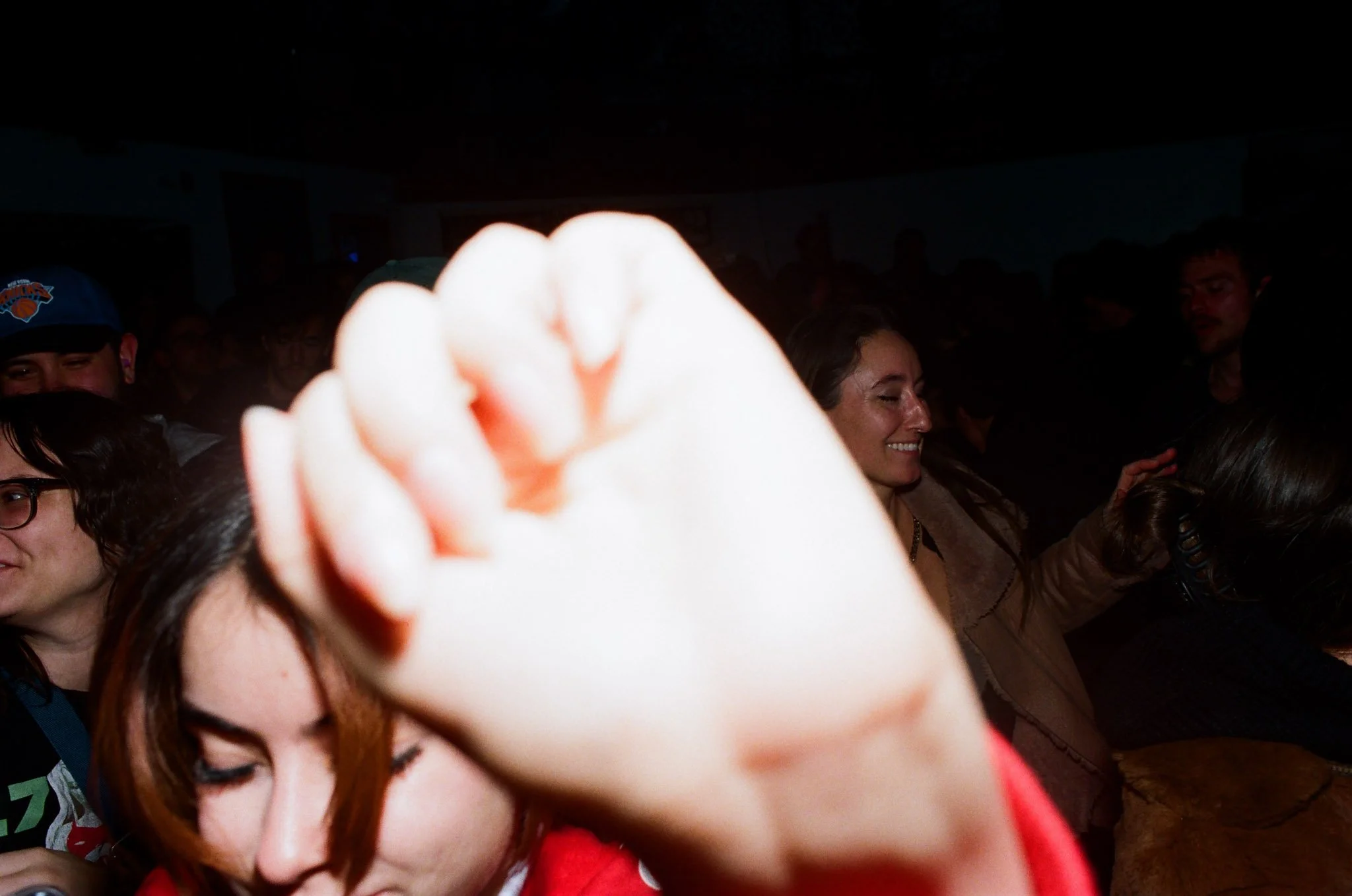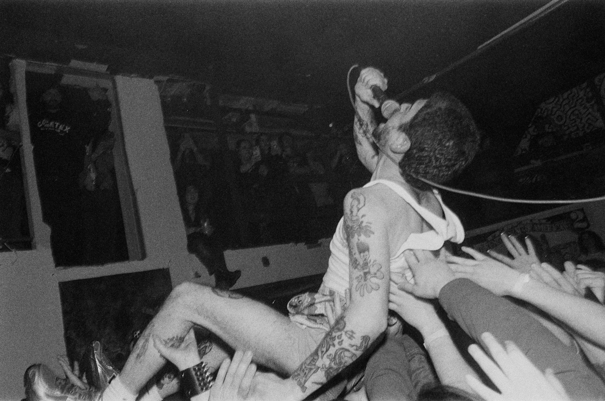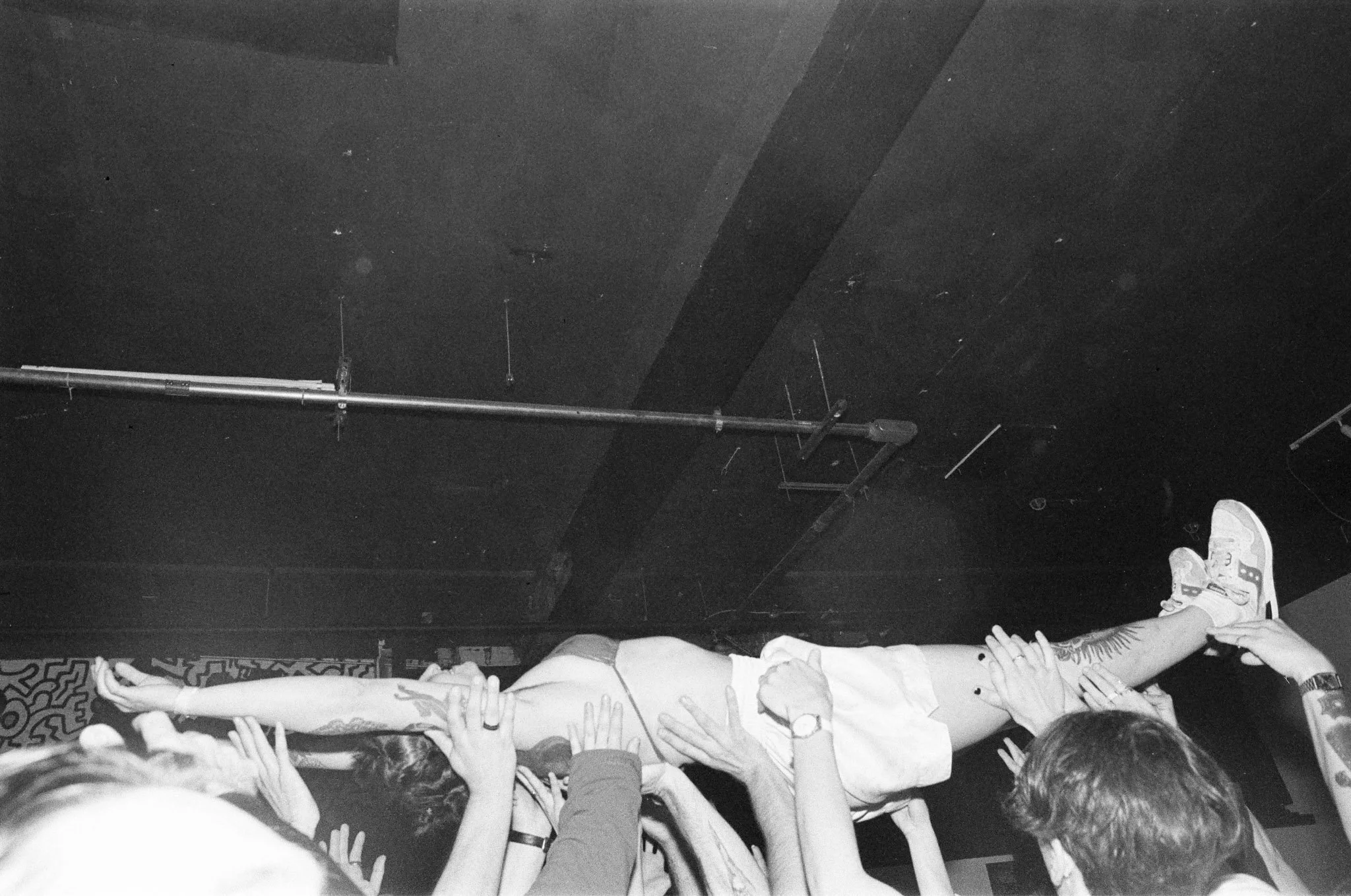 Pulling up to the boxing ring with security outside. Everyone chain smoking and speedrunning public intoxication because there is no re entry. Get inside, full on screen-printing sweatshop goin’ on in there, dudes taking off their prized Title Fight tees and getting them decked out in fresh ink. Pass all the shiny things and enter the thunderdome complete with smoke machine and boxing ring.