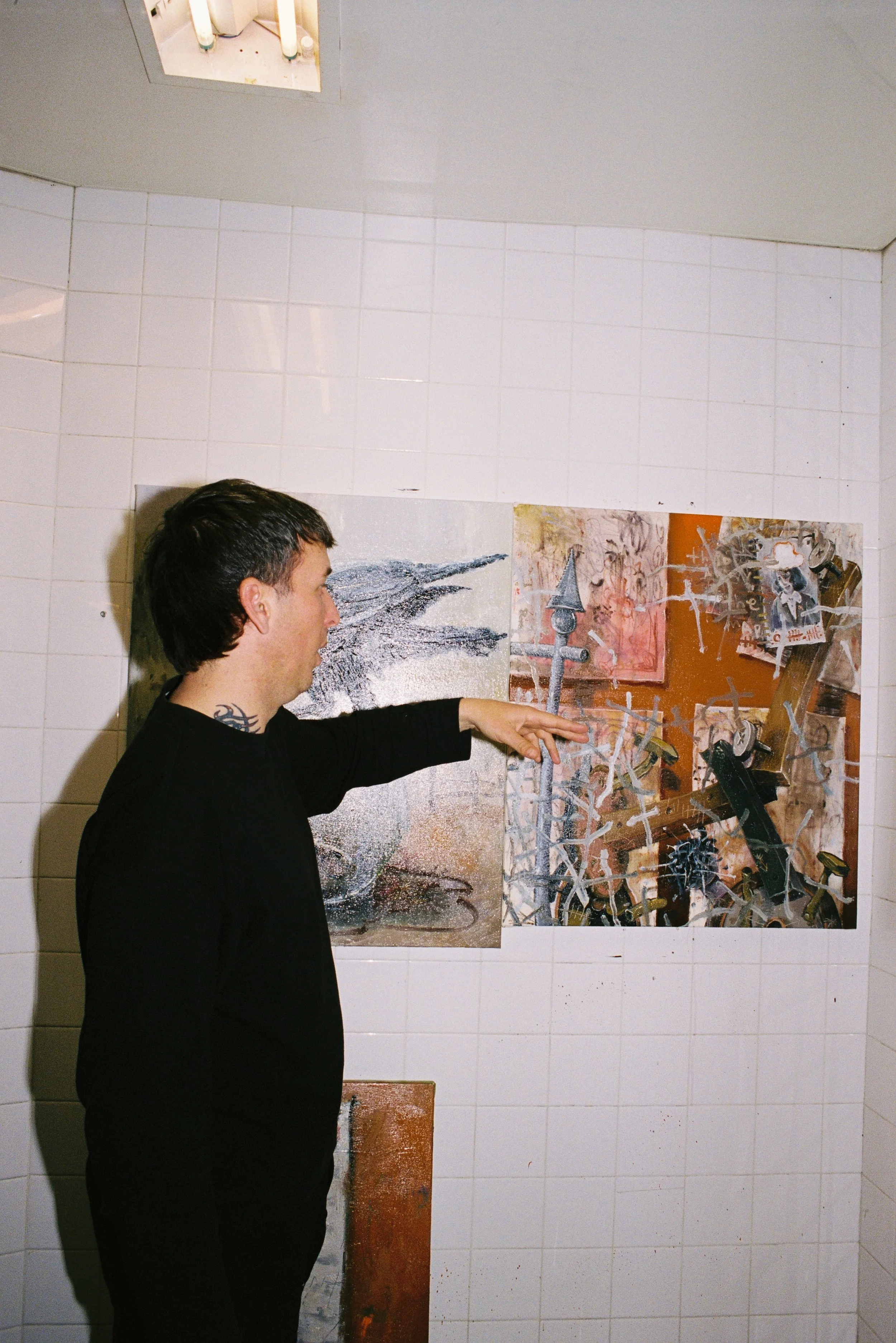 While at a glance that statement may come across as confusing, as his paintings aren’t pretty pictures of pristine landscapes or to-scale portraits, but instead a chaos of rich colours. Yet, it’s upon closer inspection, it's understood that the chaos is where the familiarity lies. The layers of paint that compose his characters with the smudges, scribbles and scratches blending into spiderwebs, stars, and the ambiguous, almost illegible phrases hidden in between are reminiscent of notebook doodles made while trying to declutter. The work is autobiographical, directly from Rhys’ mind; real life happenings, memories and dreams, driven by honesty, as each painting he says is ‘symbolic of whatever is happening in the moment’. And that symbolism remains long after the painting is done.