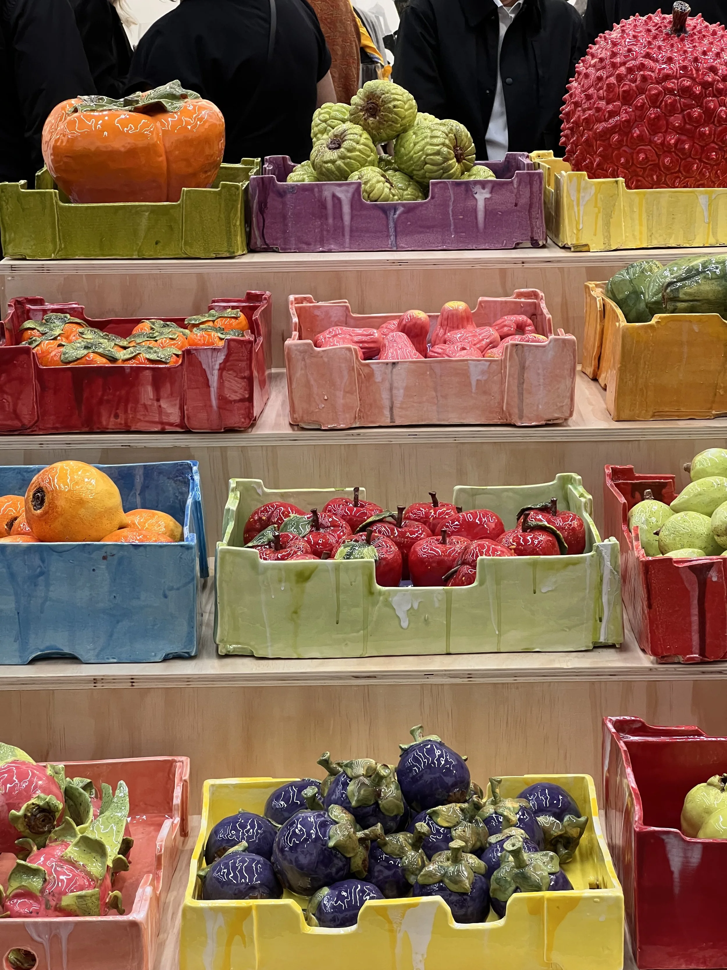 At first glance, her works are playful. Glazed ceramic fruits stacked in accompanying crates, bursting with bold, saturated colour. But beneath the surface is something much heavier. These familiar domestic objects aren’t just still lifes, they’re emotional artefacts. Each one becomes a vessel for memory, grief, and resilience.