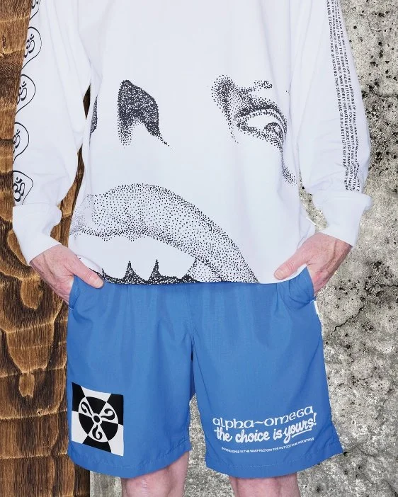 Ed Davis, the renowned artist best known for founding Los Angeles-based Brain Dead, uses motifs like spiders, clowns, warning signs, and faux-wellness logos in ways that reflect on themes of burnout, disconnection, and the empty promises of modern life. At the same time, Davis introduces a note of agency with the phrase “Alpha~Omega, the choice is yours!”, suggesting that calm and clarity are deliberate choices. The result is a collection that goes beyond style, offering a subtle but pointed reflection on how we navigate an ever-increasingly chaotic world.