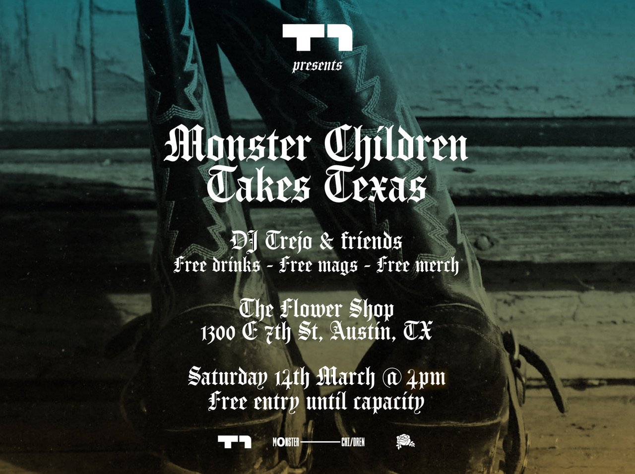 Join us there on Saturday, March 14th, at 4PM for Monster Children Takes Texas presented by our friends at T1. Free entry, free beers, free espresso martinis, free merch, free music provided by DJ Trejo and special guests from Austin’s eclectic music scene, free dancing, free love(?), free hugs provided by Jamie, free life advice provided by Naz - a good time all around. No RSVP needed, capacity limited. See you there.